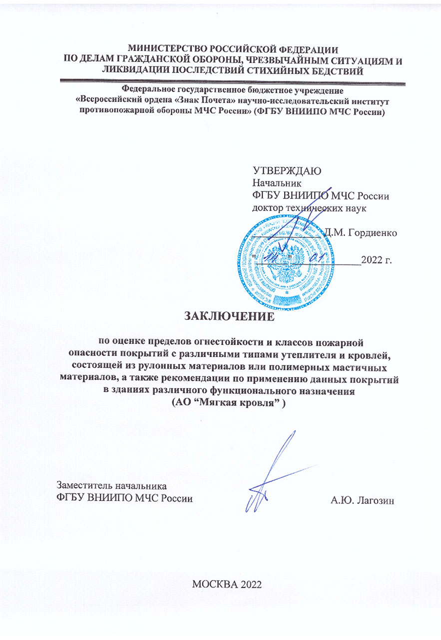 Заключение ВНИИПО МЧС по оценке пределов огнестойкости и классов пожарной опасности покрытий с различными типами утеплителя и кровлей