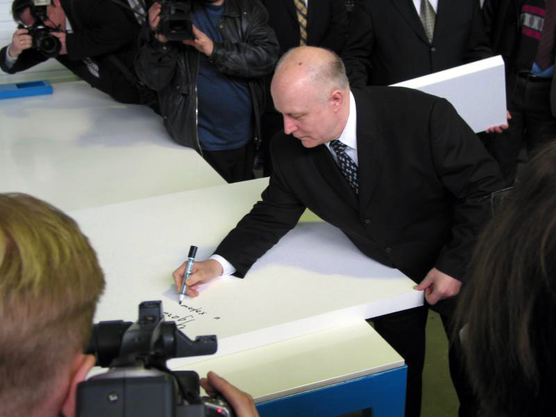 По окончании демонстрации работы оборудования, Георгий Лиманский оставил памятную надпись с автографом на одной из только что произведенных пенополистирольных плит, которая осталась на предприятии "ЕТ-пласт" на почетном месте.