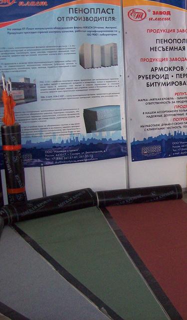 Для большей наглядности мы привезли с собой на выставку рулоны кровельного материала и развернули их прямо на полу. Заинтересованные строители свободно рассматривали предложенный материал, забирая с собой образцы рубероида, армокрова, рубемаста и пергамина производства завода «Мягкая кровля».